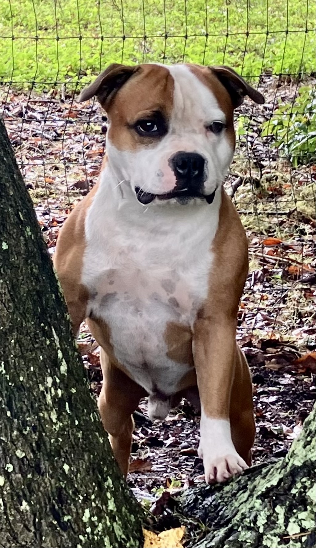 Gus is our newest boy and is bred by us. He is picture above at 18 months old. Gus is out of our girl AKC CH Rockstaff River’s Last Cheerio CGC RN TKN ACT2 ACTJ2 aka “Cheri” and AKC CH. Von’s My Loving Man aka “Colt”. Gus is a very compact boy with a lot of bone/substance and a stunning head piece. He’s an easy going, goofy boy. Gus made his show ring debut with a Best Beginner Puppy In Show and a Best In Show B-Match win. He finished his championship at just 14 months old and is working towards his grand championship. We are excited to watch this boy continue to develop and mature. Gus is CHIC health tested. He is L2-HGA and HC clear, OFA elbows NORMAL, OFA hips GOOD, and CAER eyes NORMAL. He is available at stud to approved bitches.